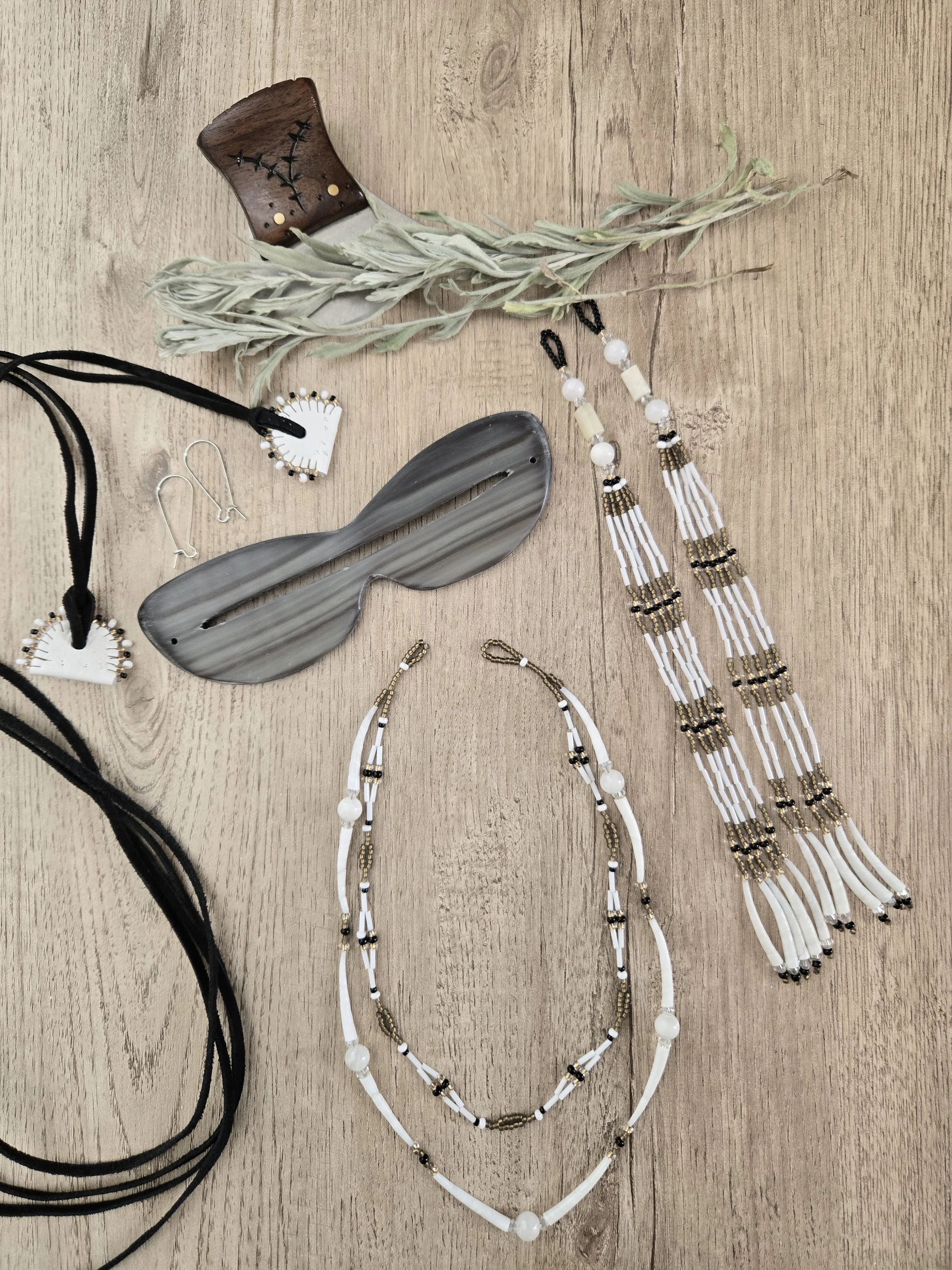 Baleen, dentalium, moonstone, leather & beadwork